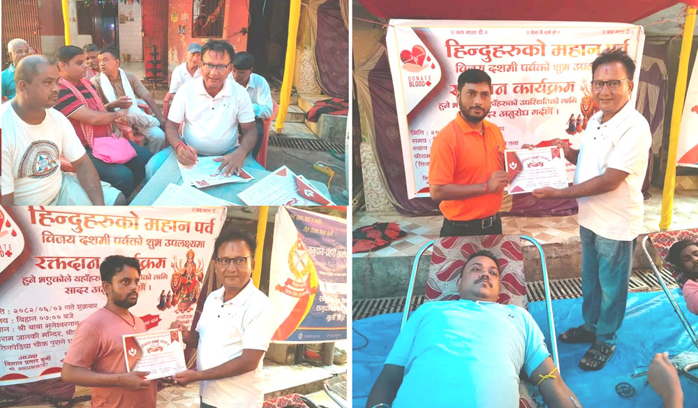 हिन्दूहरुको महान पर्व शुभ विजया दशमीको अवसरमा नेपाल हाम्रो संसार नामक संस्थाले रक्तदान कार्यक्रम सम्पन्न गरेको छ ।