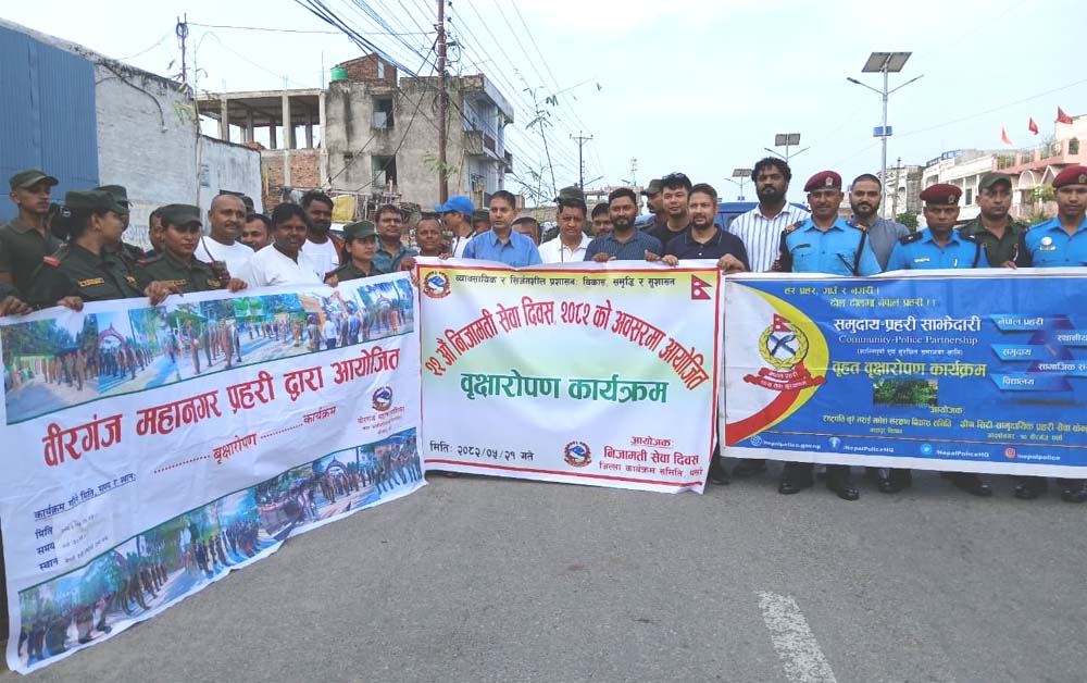 वीरगंज, २१ भदौ । २२औं निजामती सेवा दिवस २०८२ को उपलक्ष्यमा जिल्ला प्रशासन कार्यालय पर्सा तथा ग्रीन सिटी सामुदायिक प्रहरी सेवा केन्द्र, आदर्शनगर–१०, वीरगंजको संयुक्त आयोजनामा बृहत वृक्षारोपण कार्यक्रम सम्पन्न भएको छ। कार्यक्रमका प्रमुख अतिथि जिल्ला प्रशासन कार्यालय पर्साका प्रमुख जिल्ला अधिकारी (सीडीओ) तोयनारायण सुबेदी, विशिष्ट अतिथिमा मधेश प्रदेश कार्यालयका एसएसपी शान्ति राज कोईराला, जिल्ला […]