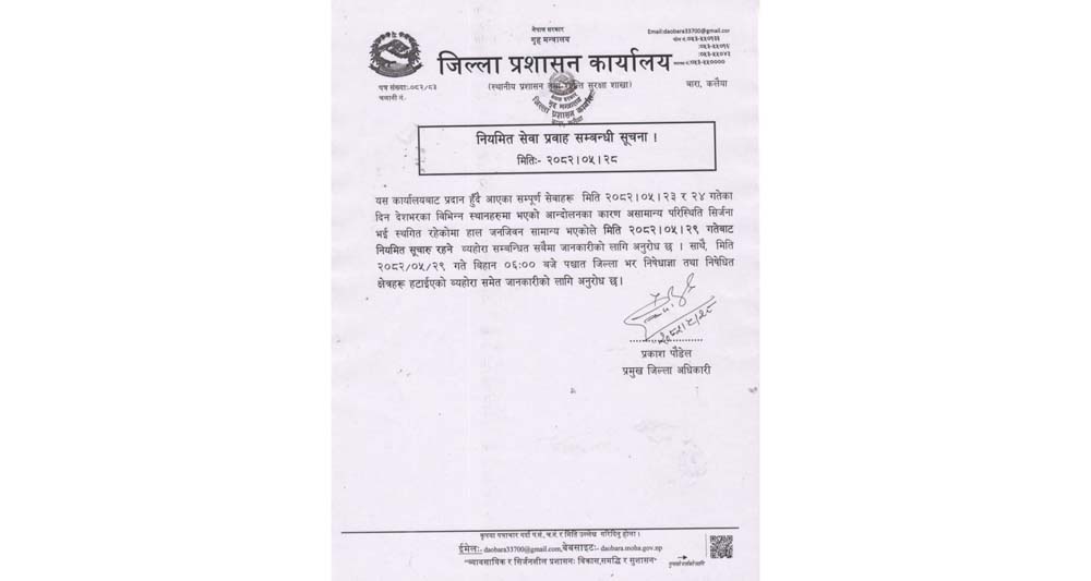 वीरगंज, २९ भदौ । जिल्ला प्रशासन कार्यालय बाराले आजदेखि बारा जिल्लामा निषेधाज्ञा हटाएको छ । प्रमुख जिल्ला अधिकारी प्रकाश पौडेलले भदौ २९ गते आज बिहान ६ बजेदेखि जिल्लामा निषेधाज्ञा हटाएको जनाएका छन् । यसैगरी, आजदेखि जिल्लाका छोटो दूरी र लामो दूरीका सवारीसाधन सञ्चालन भएका छन् भने बजार, व्यवसाय पूर्ण रूपमा खुलेका छन् । त्यस्तै जिल्लामा […]